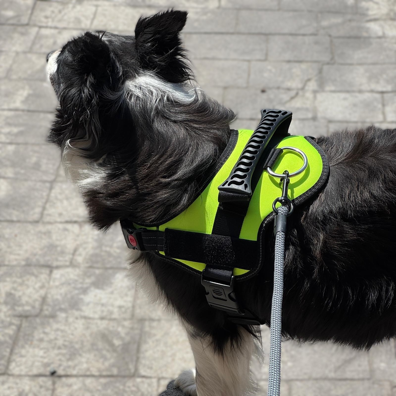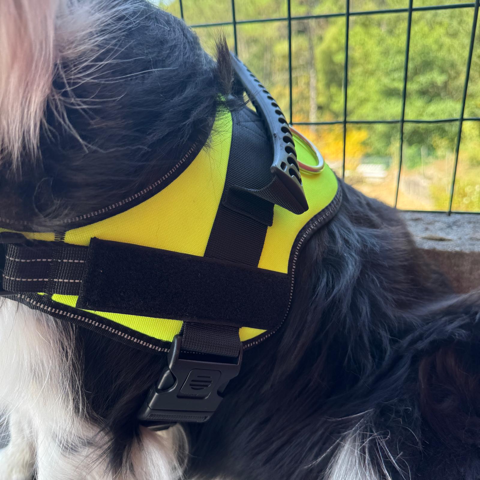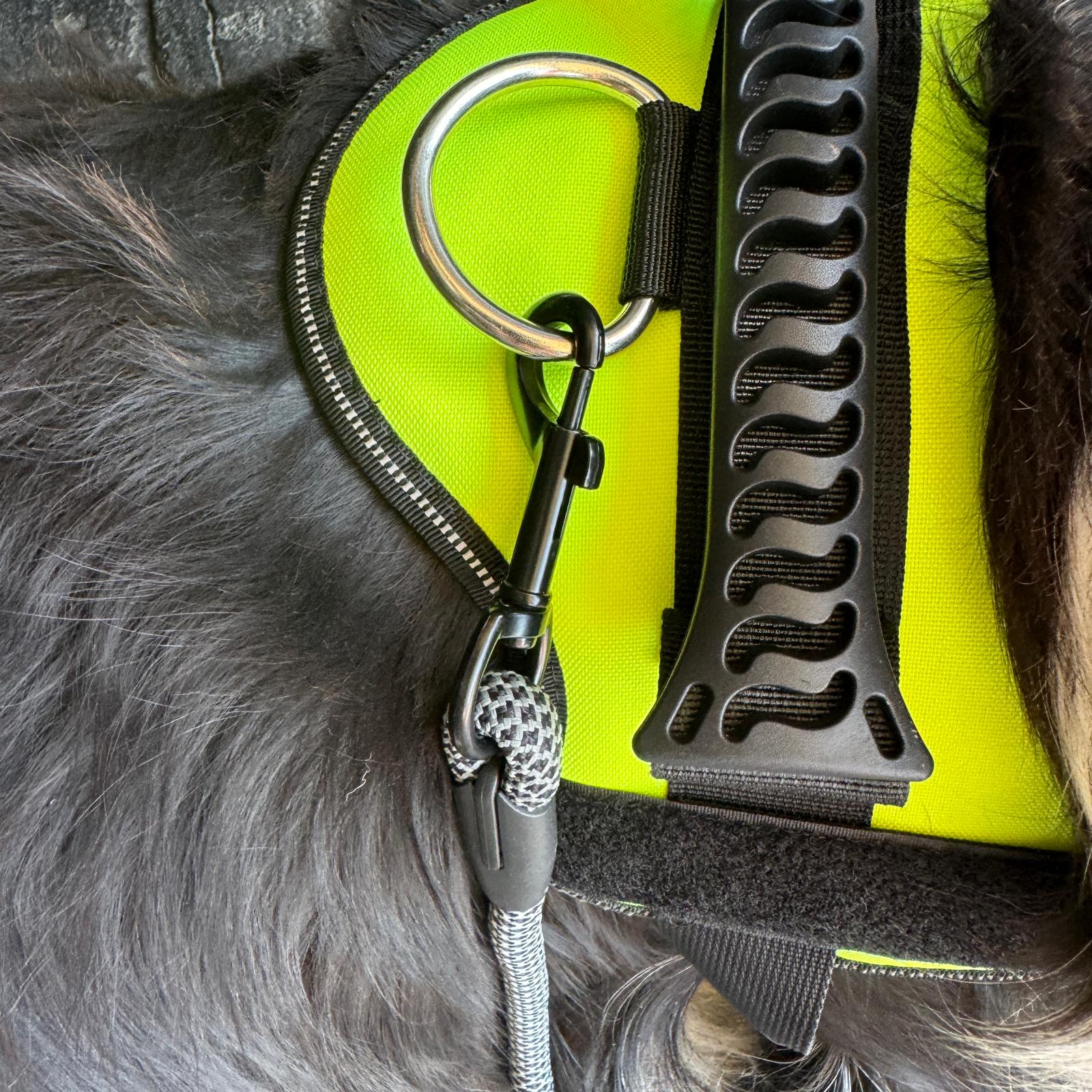 Arnés con chaleco reflectante, material nailon. Ajustable, no aprieta, cómodo y transpirable. Mango de silicona.