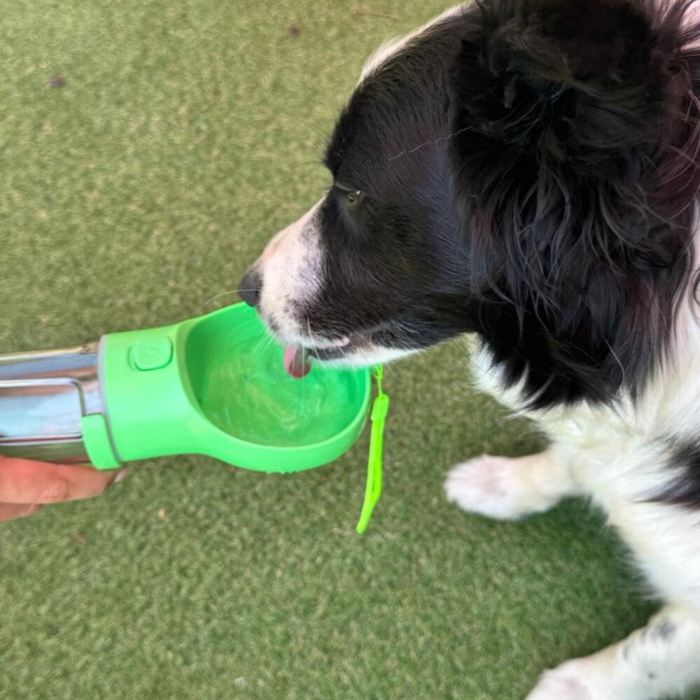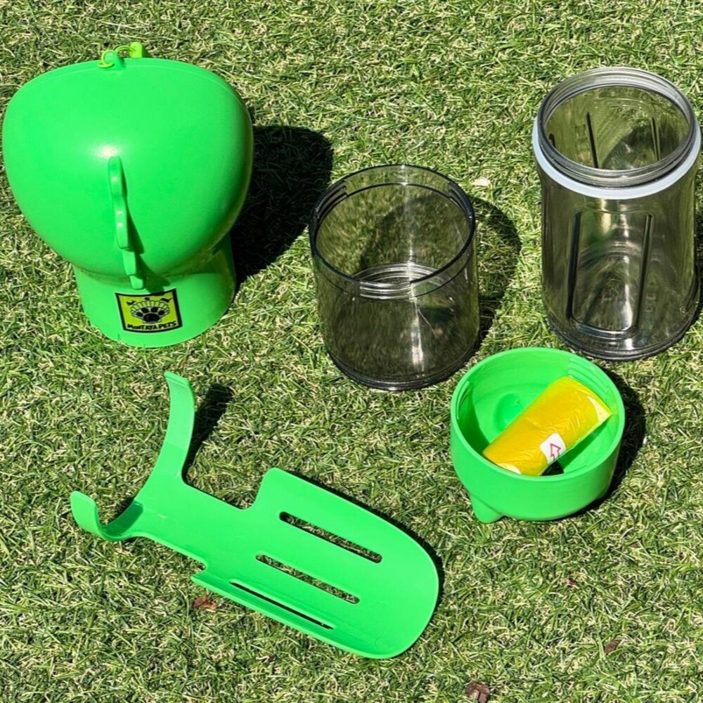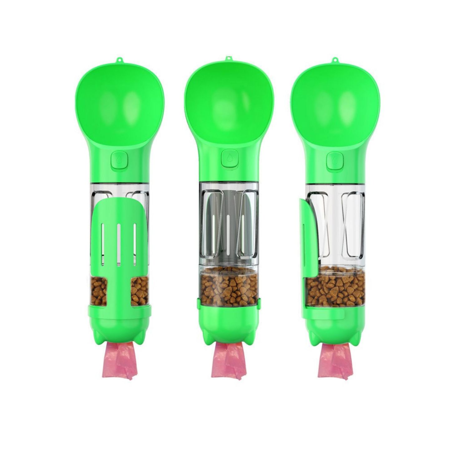 Botella de agua para perros que integra taza de beber portátil, con compartimento para comida, bolsas de basura y recogedor de excrementos. Es un producto de mascota multifuncional.