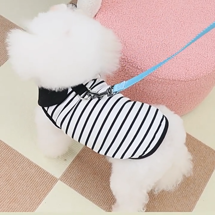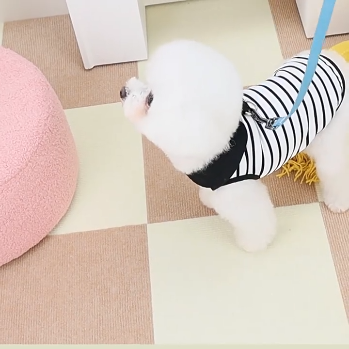 Camiseta de poliéster blanca con rayas negras. Corchete en la parte delantera del cuello. Sujeción para correa en la espalda.