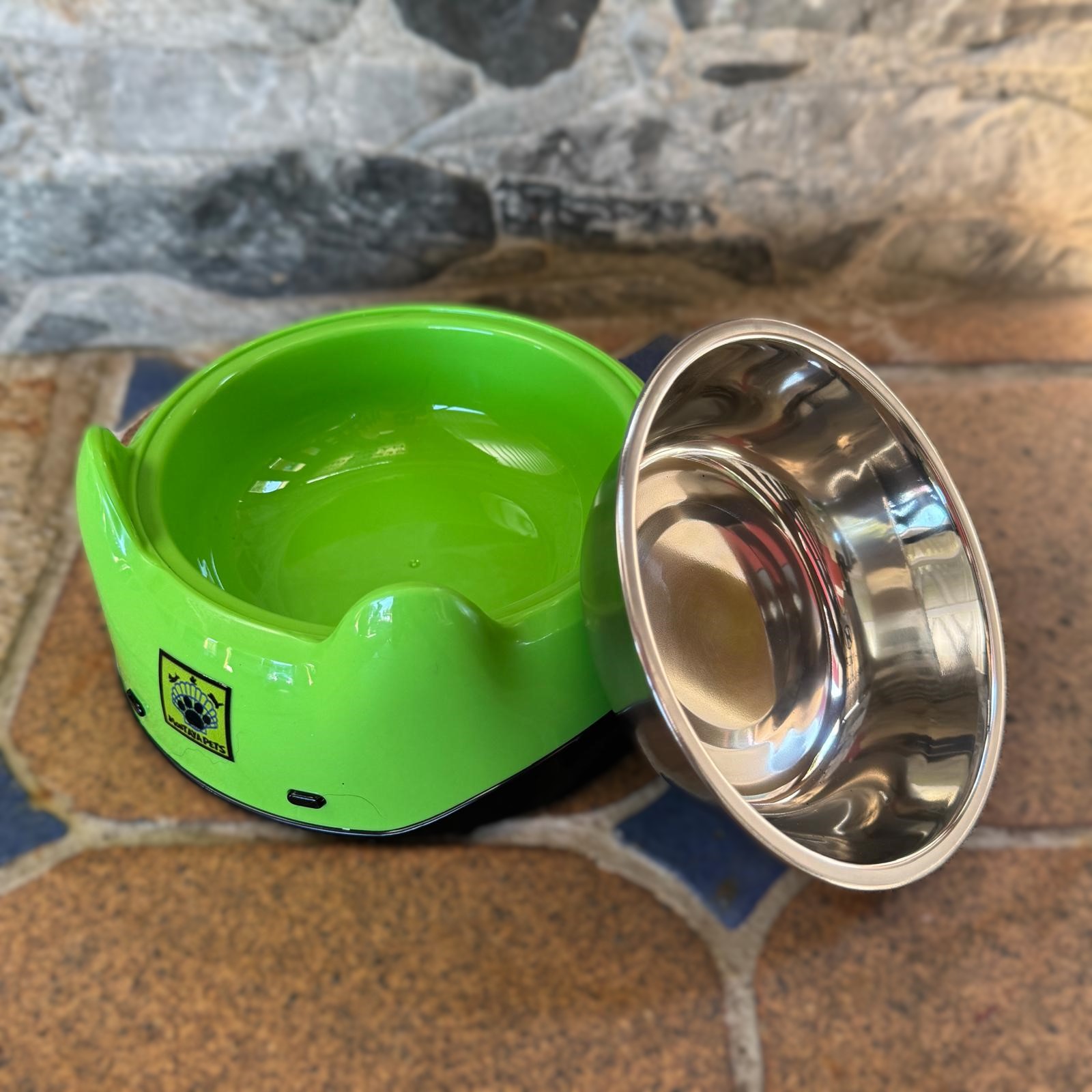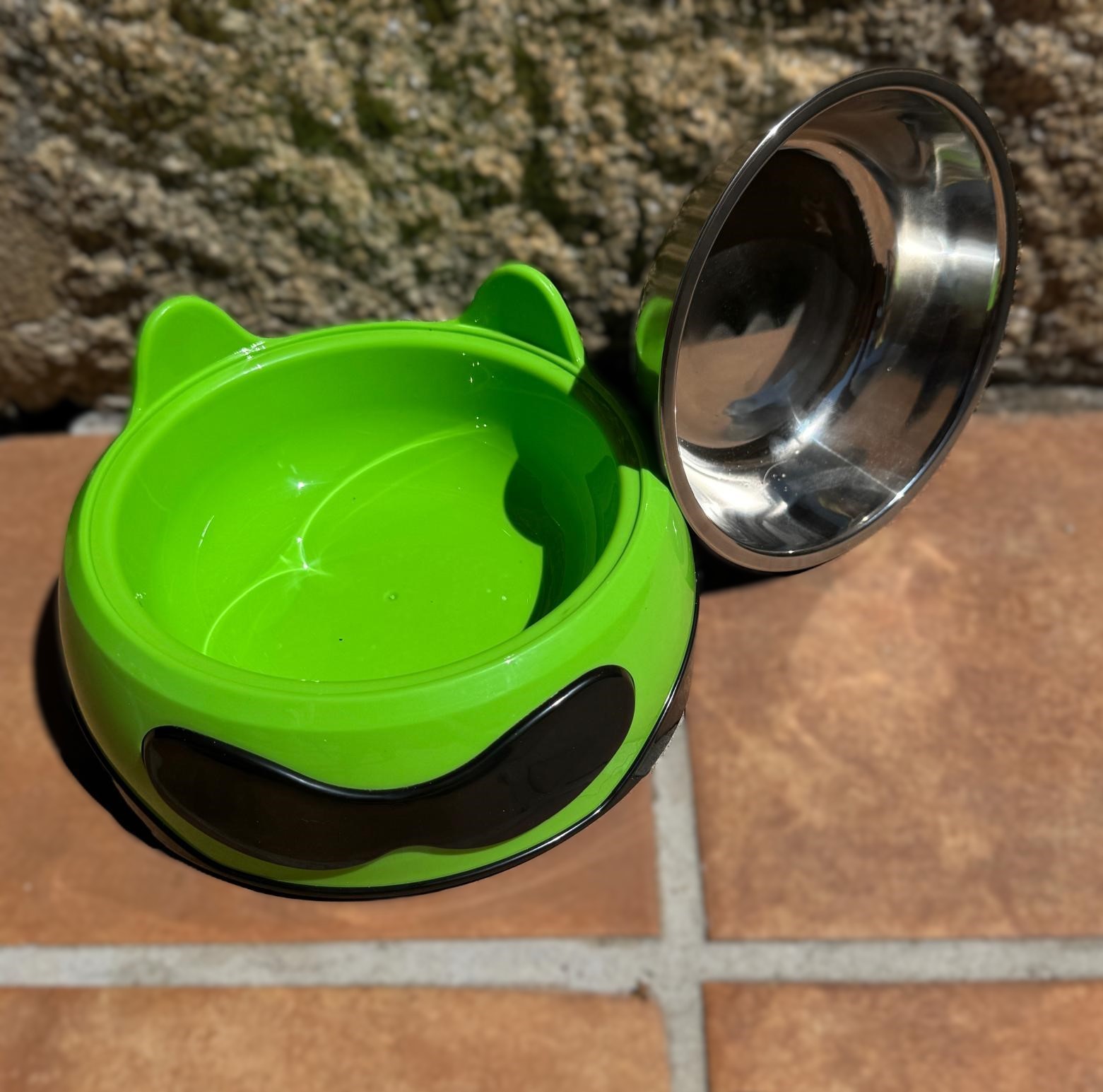 Comedero de plástico con cuenco interior desmontable en acero inoxidable. Suelo antideslizante. Medidas: 18 cm diámetro x 6,8 cm alto. Cuenco metálico: 14,5 cm diámetro x 4 cm alto. Color: verde