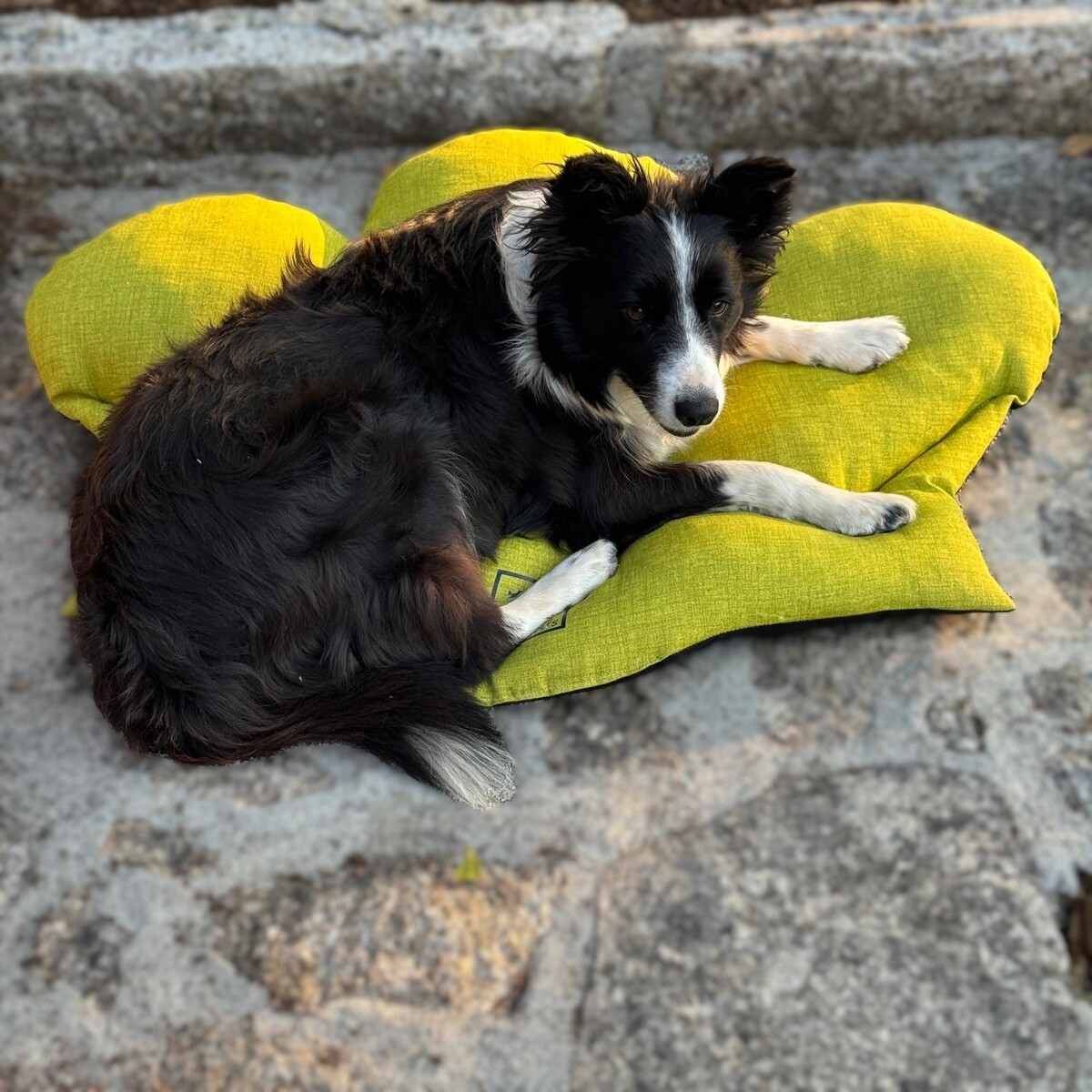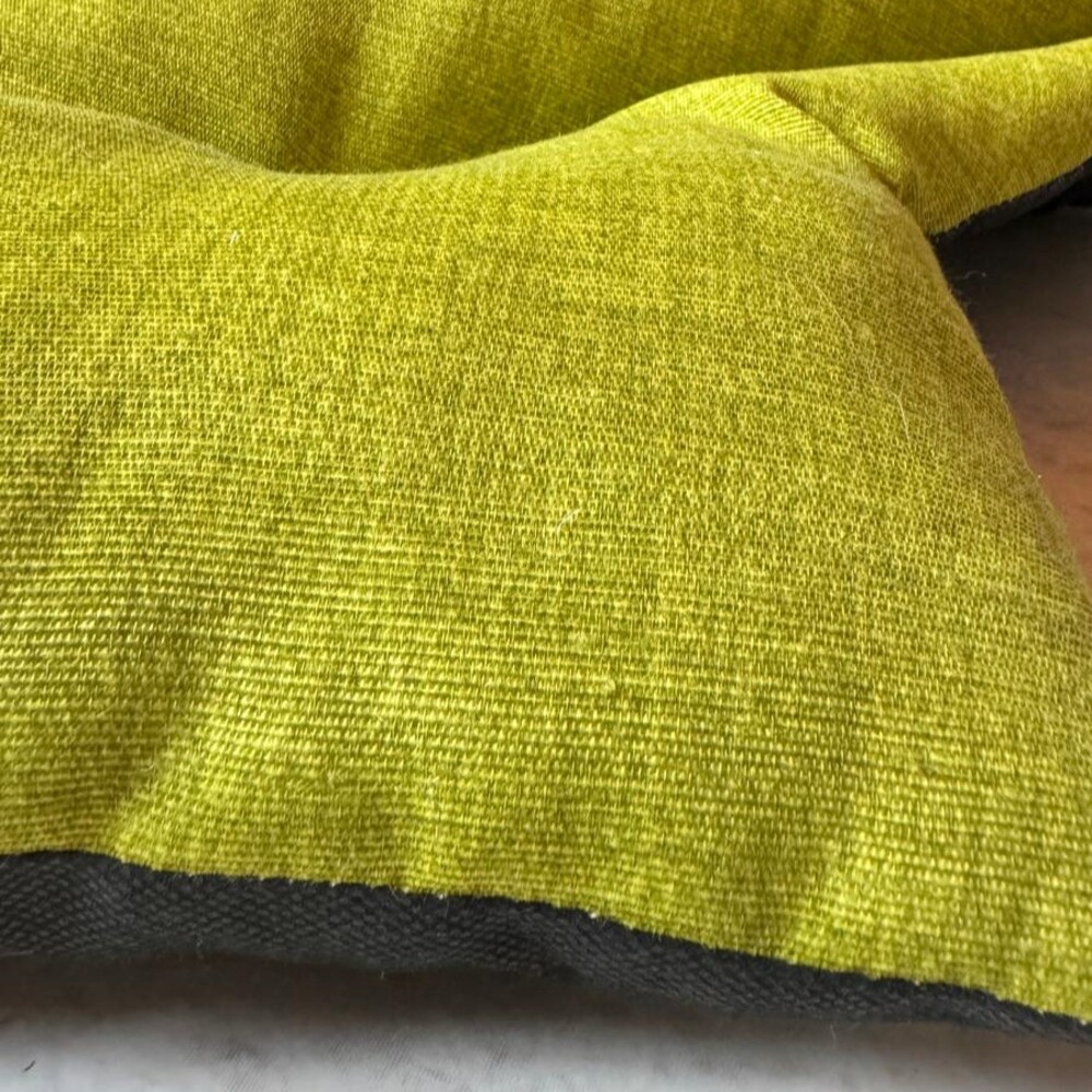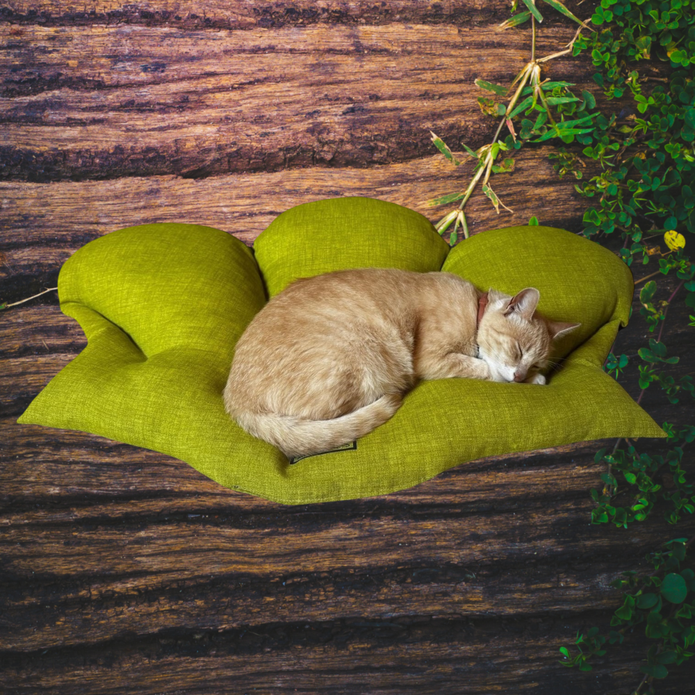 Cama de loneta rellena de fibra, modelo en forma de concha. Medidas: 110 cm x 70 cm. Color verde pistacho.