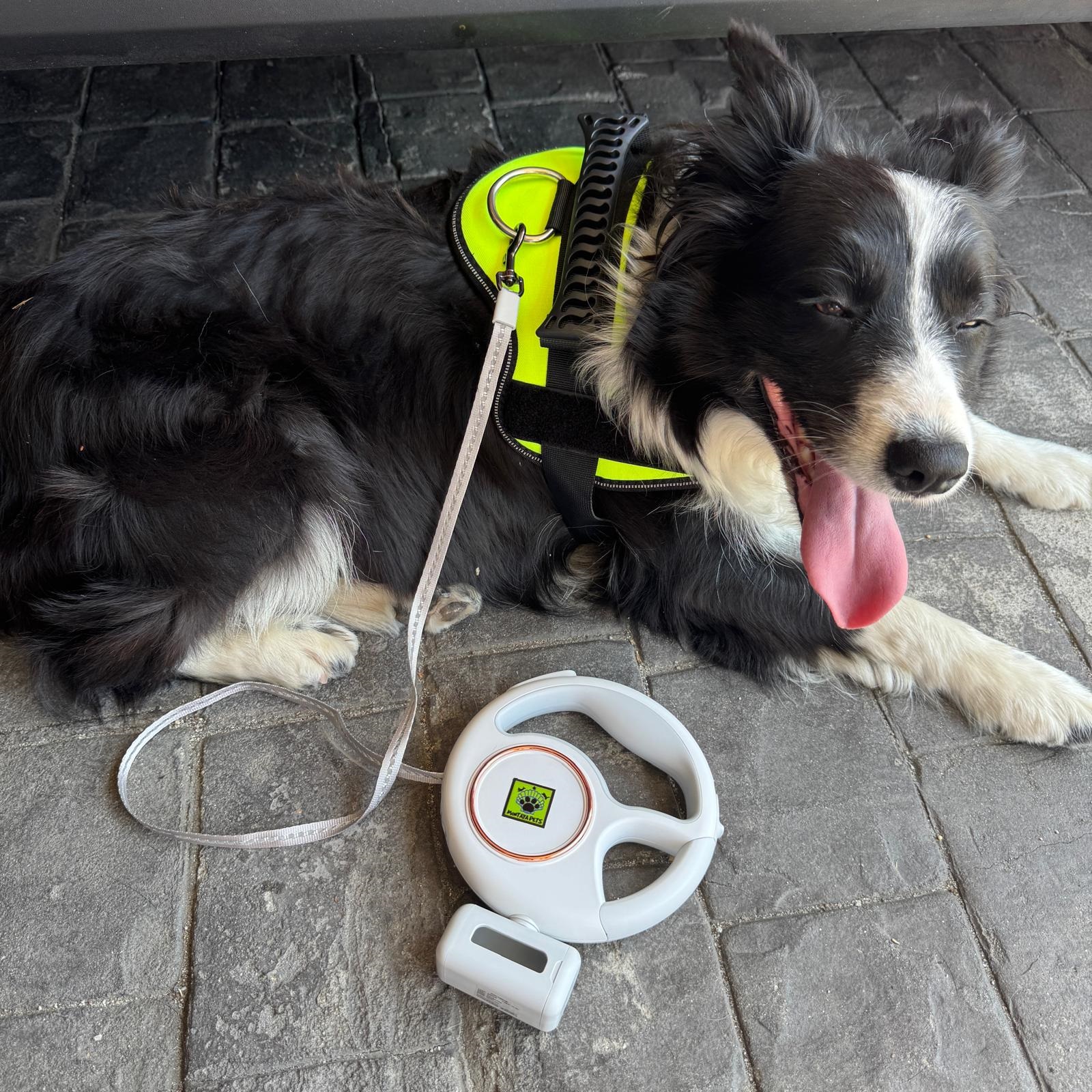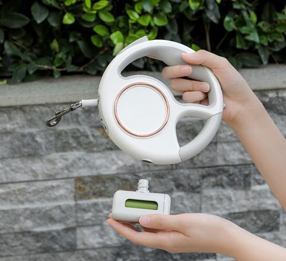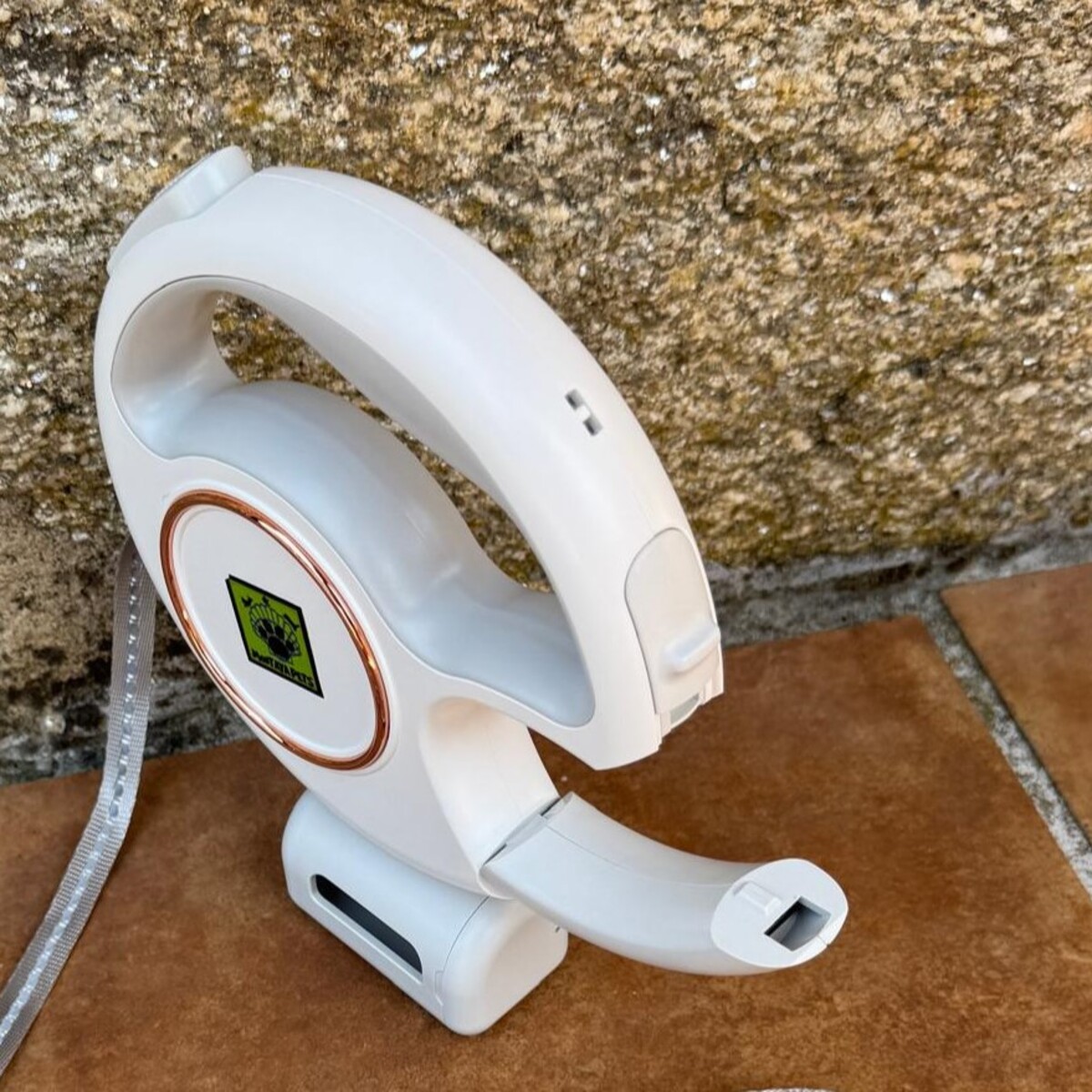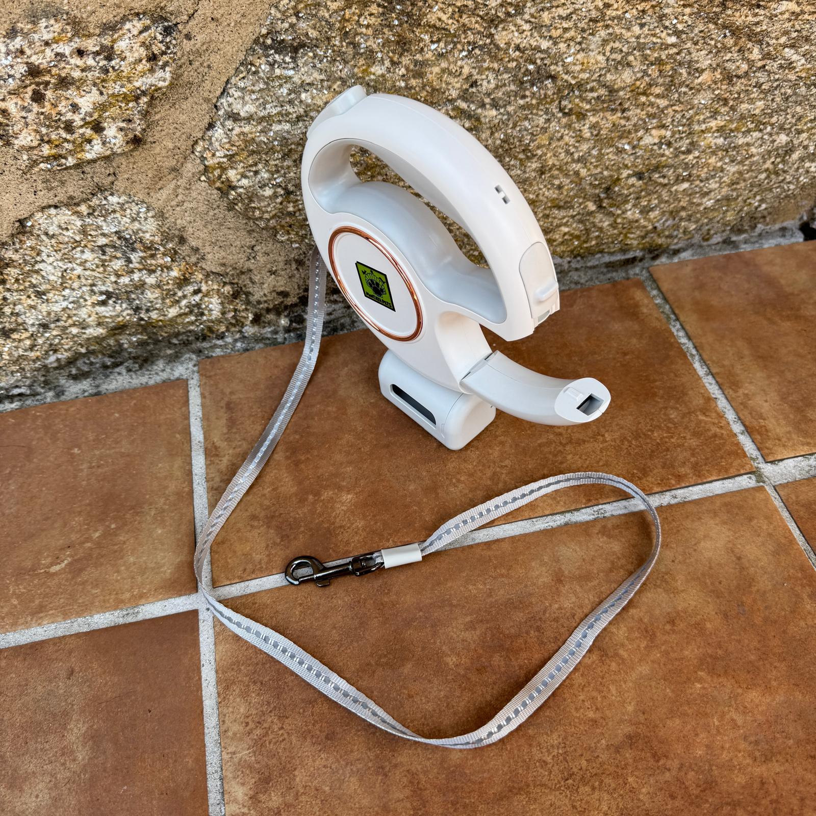 Correa de perro multifuncional, retráctil, automática y con iluminación LED. Asa apertura fácil para sujeción fija de mascotas en elementos (barandillas, cierres). Incluye portabolsas (bolsas no incluidas), cable USB y manual instrucciones.
