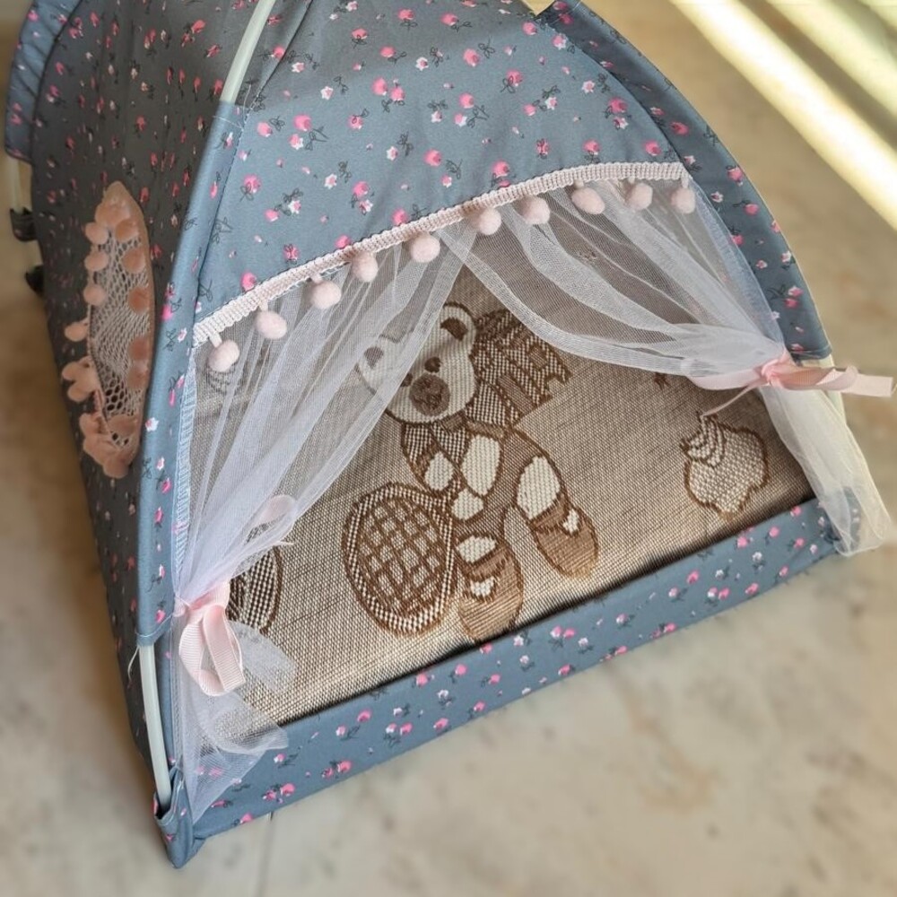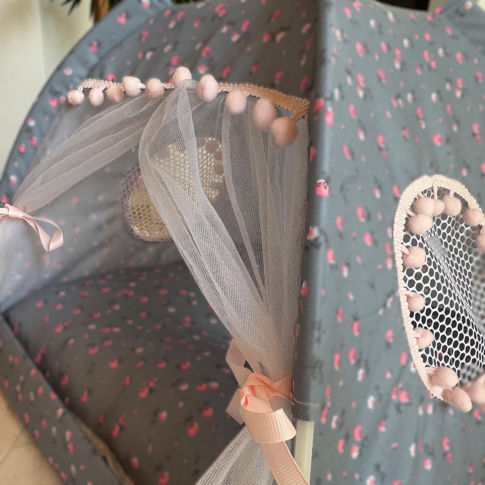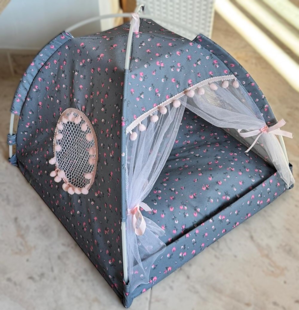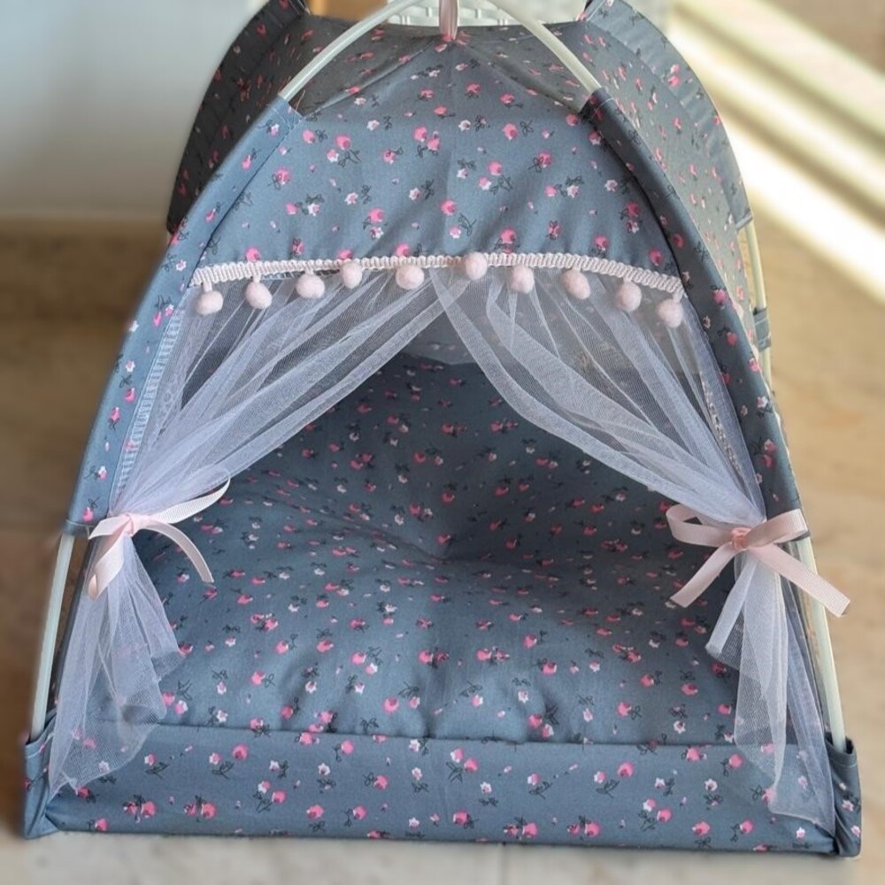 Casa de tela para mascotas semicerrada en forma de tienda. Ventana de rejilla con encaje y pelotas de felpa. Cortina de malla refrescante y transpirable, con sujeción lateral mediante pajarita. Soporte de palo de fibra de vidrio elástico y desmontable. Estera doble cara con tejido para verano-invierno. Fondo de plástico antideslizante. Material plegable, portátil y de fácil instalación. Medidas: 50 cm x 50 cm Color gris oscuro con estampado floral rosa.
