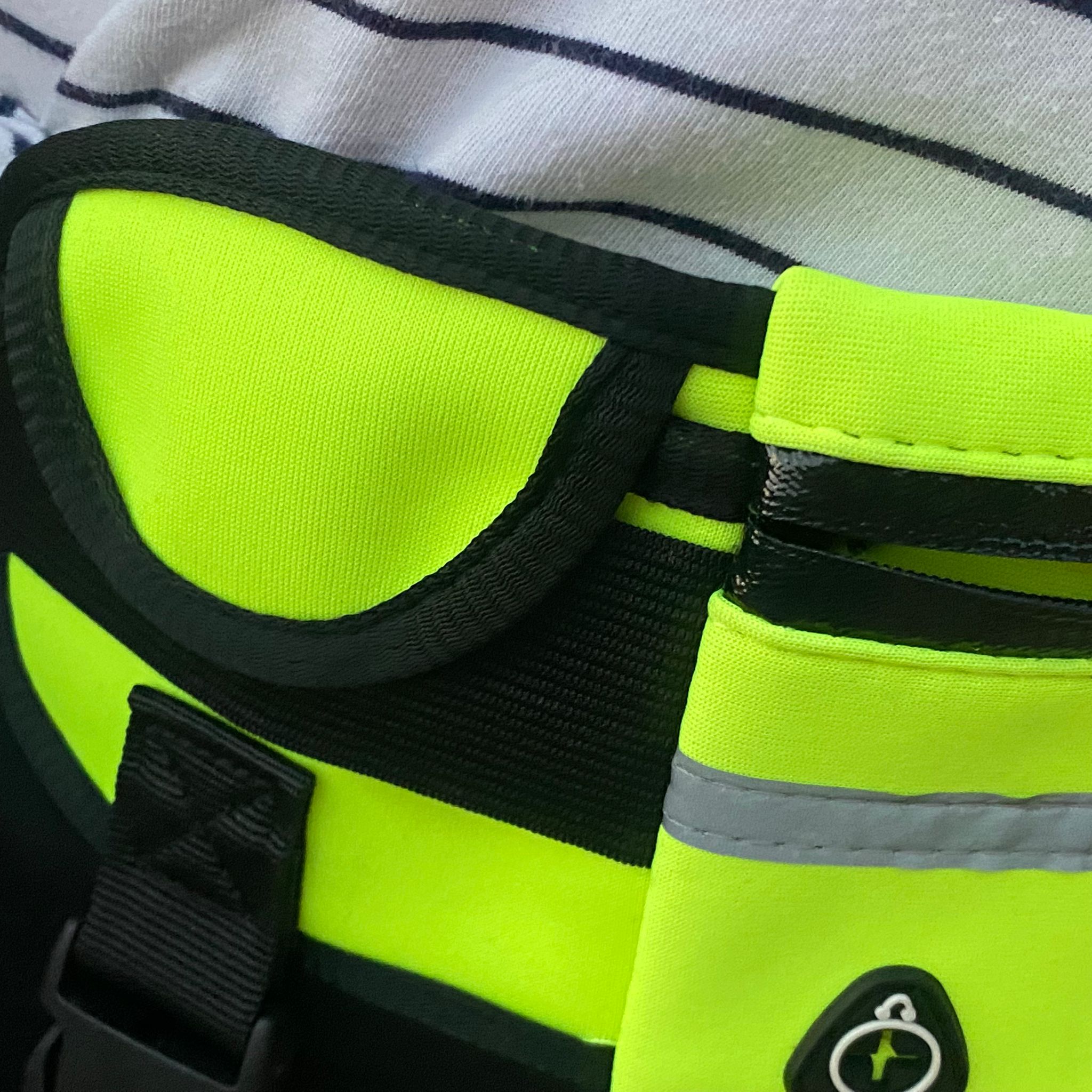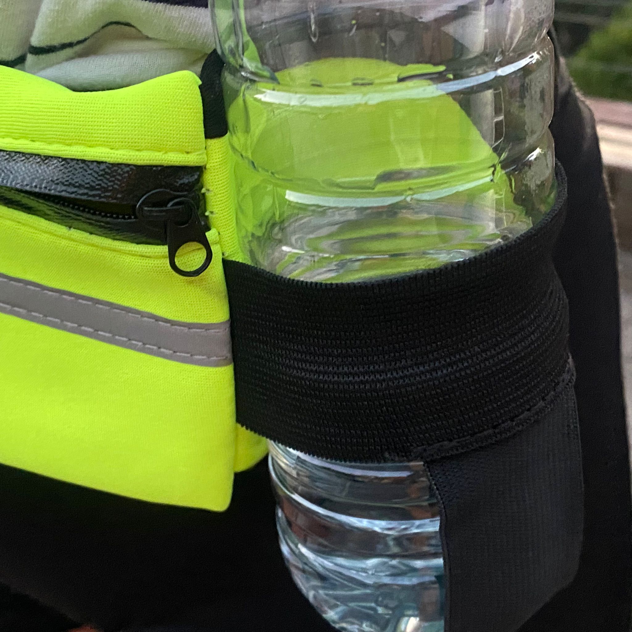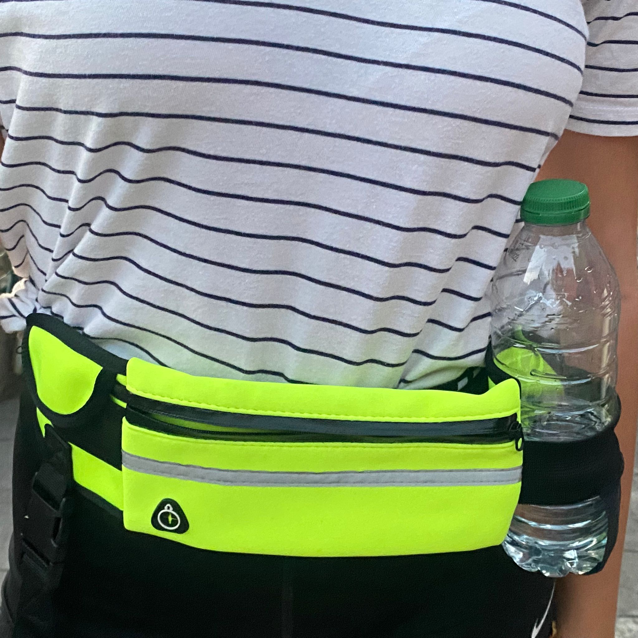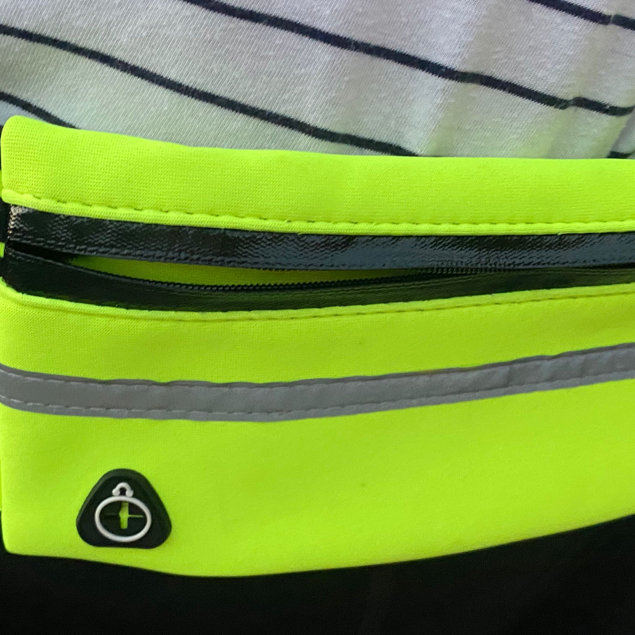 Riñonera de cintura con cuerda de tracción elástica, impermeable y reflectante. Material nailon. Protector de manos de neopreno. Soporte para botella de agua. Riñonera: 10 cm ancho, 20 cm largo. Circunferencia cintura de 65 a 115 cm. Cuerda tracción: mide 125 cm largo, se puede estirar hasta 180-220 cm. Verde fluorescente con negro.