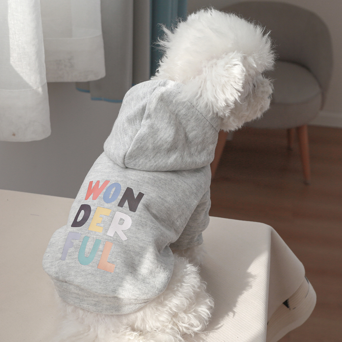 Sudadera de poliéster con capucha gris claro, letras varios colores en la espalda. Medidas: 52-56 cm circunferencia de pecho, 38-42 cm longitud de espalda