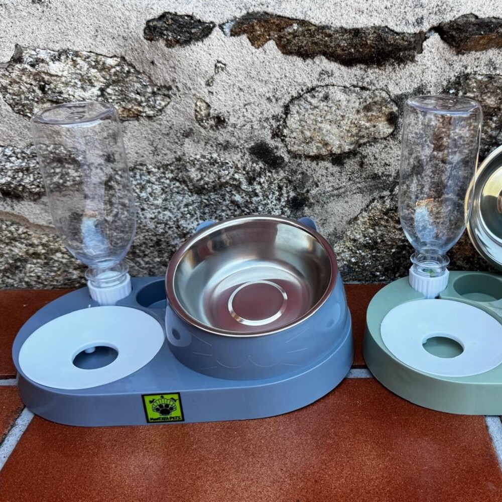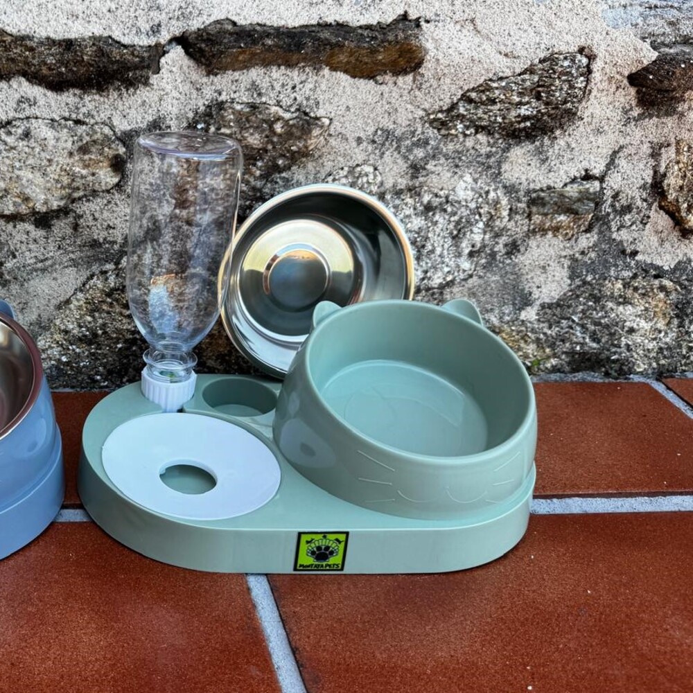 Tazón doble para gatos, con cuenco de acero inoxidable para alimentación diaria, botella de agua automática y agujero multifuncional. Soporte de plástico.